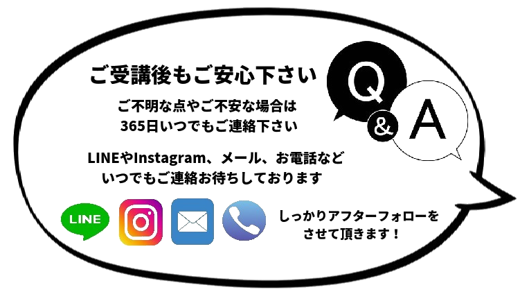 講師は美容師資格取得者、ならびにエクステ施術経験のある現役アイリストなので、ご不明な点などはご遠慮なくお気軽にご質問下さい。